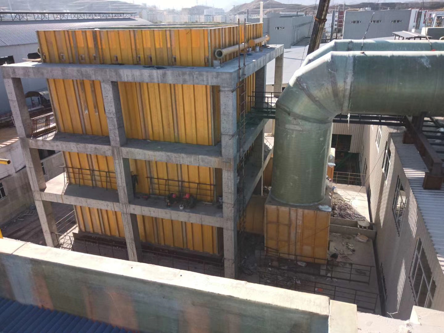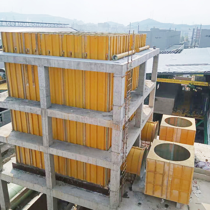 鼓風(fēng)塔塔體采用質(zhì)輕、高強(qiáng)、耐腐蝕的玻璃鋼材料制成,其結(jié)構(gòu)由內(nèi)表防腐蝕層、中間結(jié)構(gòu)強(qiáng)度層、外表抗老化層三部分組成。面板采用高強(qiáng)度鏡面模具雙面模壓成型工藝制作,確保塔內(nèi)外二側(cè)同時光滑平整,其光潔度須達(dá)鏡面化,能夠有效的防止內(nèi)壁結(jié)晶,從而對鋅電解液冷卻過程中產(chǎn)生的結(jié)晶問題進(jìn)行綜合治理。因此從整塔結(jié)構(gòu)性能來講可保證設(shè)備使用壽命大于20年。